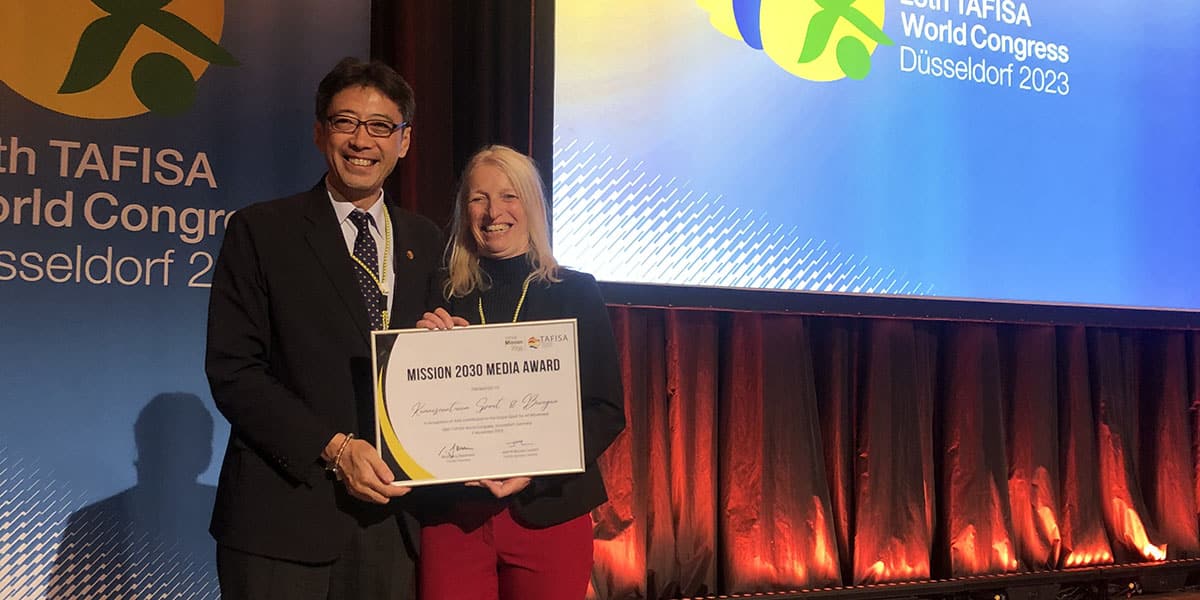 Tijdens het TAFISA Sport for All wereldcongres in Düsseldorf ontving Kenniscentrum Sport & Bewegen de TAFISA Mission 2030 Media Award. Een speciale onderscheiding voor onze communicatiestrategie en online aanpak om professionals in sport, onderwijs, overheid, zorg en welzijn te bereiken met onze kennisproducten over sport en bewegen. De award werd uitgereikt door het Japanse TAFISA-bestuurslid Max Tamazawa.